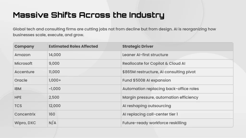 Amazon, a company that just reported $167.7 billion in quarterly revenue, is cutting 14,000 corporate jobs. Microsoft has let go of nearly 9,000 people. Accenture, the world’s largest consulting firm, is trimming 11,000 roles while training tens of thousands in AI. Oracle, IBM, and even the outsourcing titans of India are following suit.